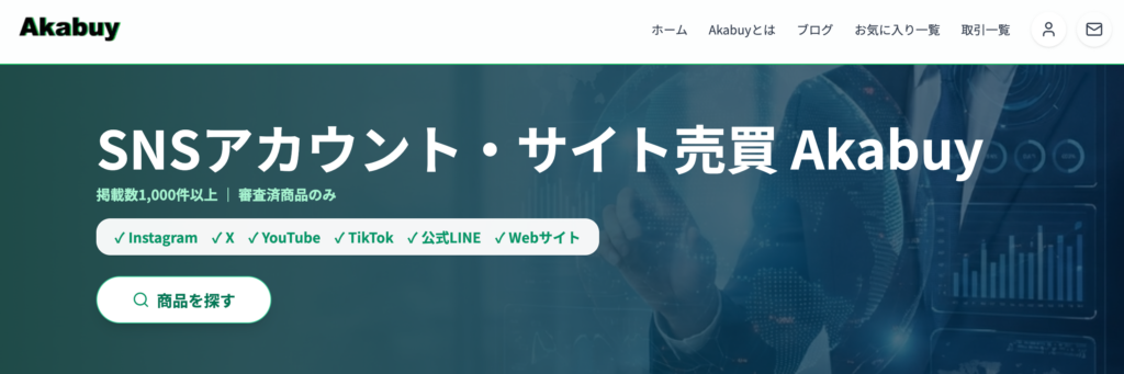 Akabuy(アカバイ)は、SNSアカウントの売買に特化したプラットフォーム。購入者側の手数料が0%で、エスクロー方式による安全な取引ができる。